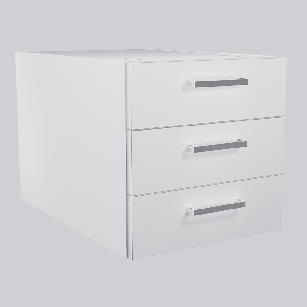 Hurts med tre lådor i vitt högtryckslaminat, inkl. beslag för upphängning. Kantlister i vitt, bok eller björk. För montage på arbetsbordets metallsarger.
