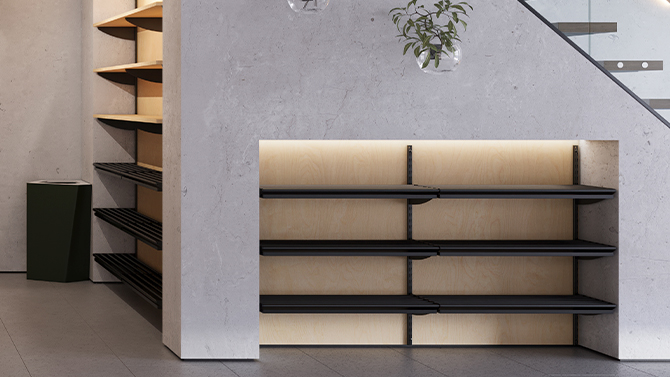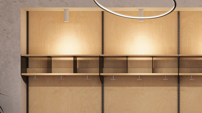 Kapprum i tidlös design. Hylltekniks flexibla kapprumsinredning i Basic-serien skapar en stilren och funktionell entrémiljö. Med klädfack Basic Tage, sittbänk Basic, skohylla Basic och våra smarta väggskenor byggs en hållbar och lättanpassad lösning för kläder, skor och väskor – perfekt för publika och frekvent använda utrymmen.